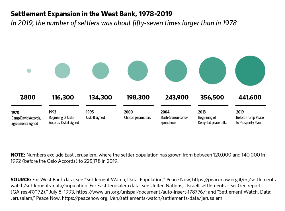 24 “Settlement Watch, Data: Population,” Peace Now, https://peacenow.org.il/en/settlements-watch/settlements-data/population; and “Settlement Watch, Data: Jerusalem,” Peace Now, https://peacenow.org.il/en/settlements-watch/settlements-data/jerusalem.